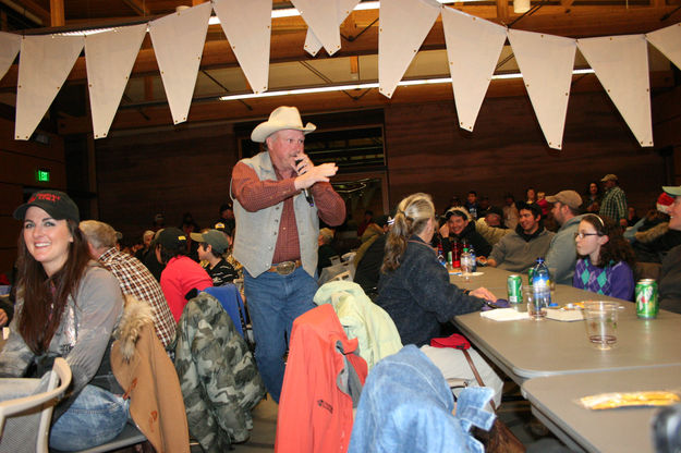 Auctioneer Dave Stephens works the crowd during the Calcutta auctioning off each musher. Part of the money raised goes to help the Sublette County Library Foundation and the rest to the library to help pay for the labyrinth decoration in the floor of the Lovatt Room. |