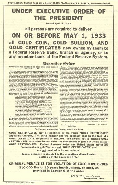 1933 "Gold Hoarders" law signed on April 5, 1933, by U.S. President Franklin D. Roosevelt, "forbidding the Hoarding of Gold Coin, Gold Bullion, and Gold Certificates within the continental United States". The order criminalized the possession of monetary gold by any individual, partnership, association or corporation. |