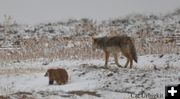 Cat Urbigkit recently had the opportunity to watch and photograph an unusual wildlife interaction. A coyote and badger have been cooperatively hunting prairie dogs in the Pinedale Anticline Project Area north of Highway 351.