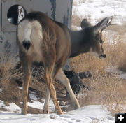 by Dawn Ballou, Pinedale Online! December 22, 2012 The ranch kitties had a friendly visitor on Saturday morning. A young buck mule deer wandered by to munch on grass and weeds near their shelter building. One of the younger cats went out to see who was there and the buck responded with curiosity. At one point, the buck bent his head down and gently went nose to nose with the brave kitten. After that introduction, several of the other kitties joined in and they all spent about ten minutes checking each other out with none showing any aggression or fear at all towards the other. |
