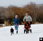 As usual, there were all types of exercisers participating. We had participants from 1-year olds Josiah Pearce, Nathan Anderson and Shaylee Paravicini to a 70-year young person. We had walkers, runners, run/walkers, trotters, baby strollers and bicycle riders. Thirteen-year old Riley Wilson was the first to finish the course on a bike. Matter of fact, he eventually circled the course three times. There were people from 10 different states, 7 towns or cities in Wyoming, and we even had Jack Morris from Scotland. There were also plenty of dogs around to help pull their owners through the course. If we added the canines to our list of participants, we would have been close to 250 involved. These added guests were not totally unobserved, for Ellen’s cats were on high alert inside the house.