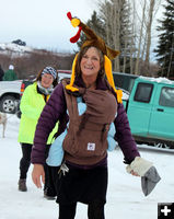 Even though this is a fun run/walk, we would like to recognize a few individuals. 17-year old Pinedale high school senior, David Rule, was the first runner to cross the finish line in a time of 19:44 (this was his second year in a row to win the running portion). David was followed by sixteen-year old Nathan Stewart in a time of 20:26. PJ Quealy of Laguna Beach, California was the first adult male in a time of 20:37. This weather sure had to be a shock from his training runs! Ken Konicek once again was the first masters runner in 20:16. Ian Policky’s dog, "Lou" was the first canine to pull their master across the finish line for an 8th place finish. As far as head turkey Sheppard, he did not fare so well. He is getting farther back in the pack, but is still having fun visiting with everyone before, during and after the race.