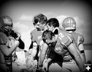 In the golden glow of a late afternoon Wyoming sun, the Big Piney band played, the cheer teams cheered and the crowd clapped as the red clad Big Piney Punchers and the white clad Pinedale Wranglers ran onto the brilliant green field of play looking every bit as fit and well trained as Wyoming Cowboys; and fit they were. Back and forth and up and down the field both teams ran, kicking up big sprays of the rubber sand buried in the turf...like a quarter horse throws up clods in a moist field. The players threw, tackled and slipped tackles, jumped and caught, jumped and missed, and dove like supermen for balls, jerseys and ankles. When teams changed possession, the players ran to the sidelines and gathered around their coach and stared into his eyes, hanging on every word he spoke.