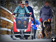This year, the supremely fit Amber Robbins pushed her two boys in a three wheeled covered carriage around the three mile course that started at the Sheppard’s garage on Sportsman’s Loop, then connected with south Tyler, and jumped onto the trail in Boyd Skinner Park across the street from the Murdock’s house. Wyatt Sheppard took his four-wheeler and pushed as much snow off the trails and roads as he could, but Amber was working like a musher…and sounding like one too as she dug in with her cleated boots and pushed her loaded carriage up and over Harmony Bridge in the deep snow…only five minutes behind the eventual first place winner David Rule, who would best his winning time of last year’s event by almost two minutes.