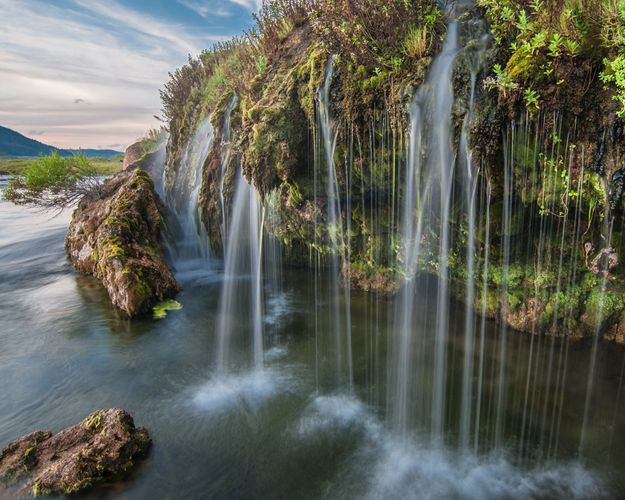 Kendall Warm Springs, Sublette County Looking up from the Green River, this perspective of Kendall Warm Springs illustrates the magic of falling water. Extensive set up utilizing tripod, wide angle lens, neutral density filter and slow shutter speeds all contribute to the dreamy water effect. |