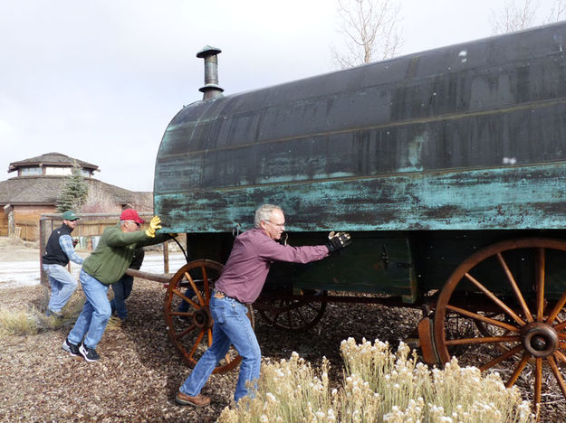 | Pinedale Online > News > December 2015 > Two sheepwagons donated to Sublette County Historical Society > Rolling into place |