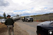 May 19, 2016: I arrived at the main entrance to Half Moon Lake. Way down below on the lake, the expected sonar boat from Utah had arrived and was searching in a grid pattern in the area of the boat dock. Wyoming Highway Patrol Trooper, J.B. Moeller was standing beside his vehicle just offside the pavement. "I’m just here to help with the roadblock and to make sure no one interferes," he said. Sheriff Haskell and Sgt. Petersen arrived on the scene as did a number of Utah media vans full of cameramen, producers and commentators. I stood beside Sheriff Haskell and we spoke as he was fitted with his microphone for his interview. "We know the water is shallow and normally a truck wouldn’t sink all the way," he said. "But, sometimes strange things happen. It could float out to deeper water and flip upside down. The bottom side of trucks is usually dark, so they would be hard to see from the surface." As we spoke, what looked like a civilian Beechcraft Bonanza began doing a circle around Half Moon Lake. "Yes, it is a civilian aircraft," Haskell said. "Right now, we don’t see a need to block airspace."