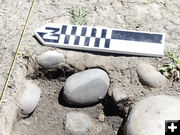 Some of the dirt appeared to possibly have an oily residue. The dig feature is near the old Homestead garage and the residue could have come from drips off of vehicles or equipment parked nearby or discarded oil. More tests would be needed to positively identify the substance.