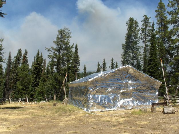 | Pinedale Online > News > July 2016 > Cliff Creek Fire update – July 30, 2016 > Craig Cabin under fire protection wrap |