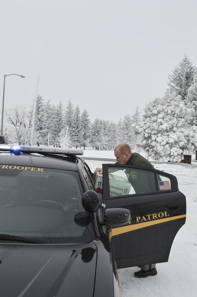 Wyoming Highway Patrol Lt. Tim Romig places platelets into the back of his patrol car from United Blood Services in Cheyenne, Wyoming, Feb. 3. The platelets were needed at the hospital in Rock Springs. Photo courtesy Wyoming Department of Transportation. |