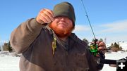 James Burnside and his son Cody were each holding onto an end of a 23-inch trout trying to stretch it to make the 24 inch minimum to have it recorded on the board, but finally gave up. "We knew we were in an iffy spot on the ice when we watched a lady catch four fish but could only get two of them thru the ice," said James. "She had a little bitty ice auger and two of the fish finally got loose and swam away before she could squeeze them thru the hole."