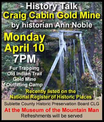 | Pinedale Online > News > April 2017 > Craig Cabin & Gold Mine – History talk by Ann Noble April 10th in Pinedale > History talk April 10th |