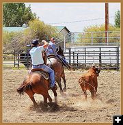 Kaleb and Cale were running the stripping chute. That's where the roped steers get loose of the ropes on their heads and their heels. Kaleb poked Cale in the chest with a rolled up wad of greenbacks and said: "Yer' gonna be on yer' own for a bit, I'm goin' for a burger." and off he went.