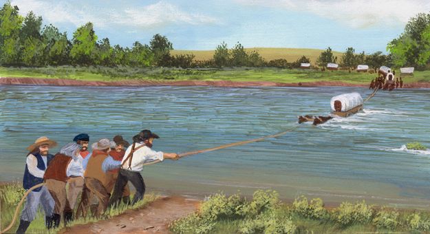 | Pinedale Online > News > August 2017 > Sunday things to do around Pinedale waiting for the eclipse > Wagons crossing river in medium water |