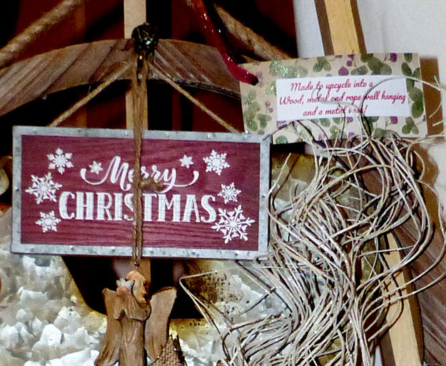 Yvonne Primanis' wreath was made to unicycle into a wood, metal and rope wall hanging and a metal vase.