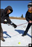 Mindi and Allison got everyone’s attention and recited some rules, and Mike Harker said, "Baby, let’s do it" and everyone grabbed their sleds full of balls, clubs and beers and pulled them out the doors and to four different starting T’s. There was a stiff crosswind of about 20 mph and pretty much everyone sliced dramatically right, except when the wind stopped abruptly during someone’s wind compensated swing and they hooked it into the next county. It was sort of like surprising a club carrying covey of Quail…they just scattered everywhere. Allison seemed to find a solid technique for the day. "I’m feeling pretty solid with my 5 iron," she said. "I’m hitting a pretty consistent Ice Worm Burner." Monte used his Snow Wedge and dropped his ball right onto the Tan #4 Green.
