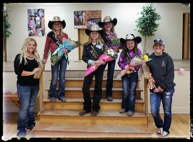 Queening Committee with Royal Court: L to R: Cassee Butler, Cedar Stewart- Queen, Kaity Shreve- Jr. Princess, Bailey Wing- Sr. Princess, Matazie Jones- Peewee Princess, and Kim Bray. |