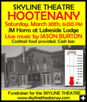 Everyone is invited to a Hootenany to benefit the Skyline Theatre Project at 6:00PM at JM Horns Restaurant at Lakeside Lodge on Saturday, March 30th. There will be live music by Jason Tyler Burton. (Update: Special thanks also to musicians Talli Manning, Terry