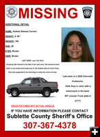 (Picture shown is not actual vehicle.) Aubree Coronoa was last seen in a 2005 Chevrolet Avalanche, license plate 4-21717 with a motorcycle in the back. If you have information about her or the vehicle, please contact the Sublette County Sheriff’s Office at 307-367-4378.