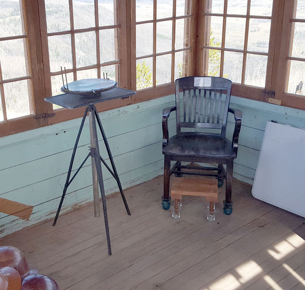 The Forest Service brought a firefinder for display inside the lookout. Richard Kail fixed up the chair and footstool (note the glass insulators on the furniture legs for lightning protection.) |