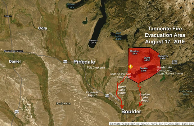 | Pinedale Online > News > August 2019 > Tannerite Fire burning near Boulder Lake > Evacuation Map |