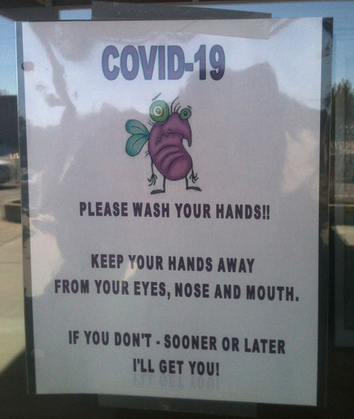 Sign on door of Rendezvous Pointe Senior Center in Pinedale warns people to wash their hands and avoid touching eyes, nose and mouth to keep from getting the coronavirus. |