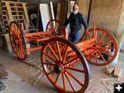 Gary Stephenson stands by the newly painted running gear on the sheep wagon. Gary has painstakingly restored the wheels and running gear. The bright orange paint matches the color the wagon was originally painted. Photo taken early October, 2021.