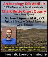 There will be a meeting of the Upper Green River Basin Chapter of the Wyoming Archaeological Society (WAS) on Tuesday, April 19th starting at 6:30PM at the Museum of the Mountain Man in Pinedale. There will be a short business meeting, then a talk by a specia