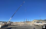 Bob Rule, KPIN 101.1 FM radio, sent in this photo of a giant crane lifting the beginning metal support structures for the county’s new Critical Access Hospital and skilled nursing facility being built in Pinedale. It is expected to be completed in the spring o