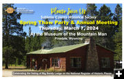 The Museum of the Mountain Man invites everyone to their 2024 Spring Thaw Party & Annual Meeting of the Sublette County Historical Society on Thursday, March 7, 2024 at the Museum in Pinedale. Social hour is at 6:00pm with light food and refreshments. There wi