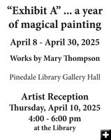 Artist Reception April 10th April 8, 2025 Local artist, Mary Thompson, will have an art exhibit of her works on display at the Pinedale Library from April 8th through the 30th. The show is titled "Exhibit A:...A Year of Magical Painting." |