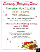 Everyone is invited to a Community Thanksgiving Dinner Thanksgiving Day, Thursday, November 27th at Our Lady of Peace Catholic Church in Pinedale, 112 S Sublette Ave. from noon to 2PM. Free, all welcome. Interdenominational Worship Service starts at 11:00AM.