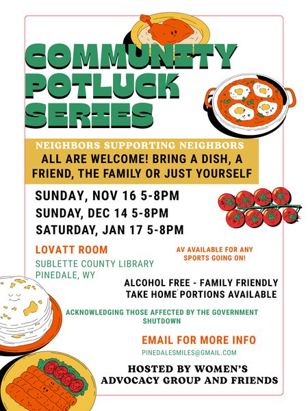 The Women’s Advocacy Group and Friends are hosting a series of Community Potlucks to help support those who are affected by the government shutdown. All are welcome. Bring a dish, a friend, the family, or just yourself. The meals will be from 5-8PM in the Lovatt Room of the Pinedale Library. This is an alcohol free-family friendly event. Take home portions available. For more information, email pinedalesmiles@gmail.com. Community Potluck dates: Sunday, November 16, 5-8PM Sunday, December 14, 5-8PM Saturday, January 17, 5-8PM Winter fly tying nights offered in Pinedale (posted 11/6/2025) Veterans Day activities in Pinedale Nov. 11 (posted 11/5/2025)