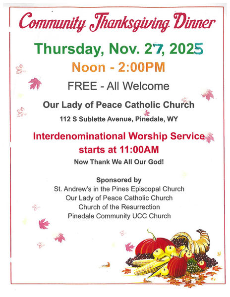 Everyone is invited to a Community Thanksgiving Dinner Thanksgiving Day, Thursday, November 27th at Our Lady of Peace Catholic Church in Pinedale, 112 S Sublette Ave. from noon to 2PM. Free, all welcome. Interdenominational Worship Service starts at 11:00AM. Sponsored by St. Andrew’s in the Pines Episcopal Church, Our Lady of Peace Catholic Church, Church of the Resurrection, Pinedale Community UUC Church.