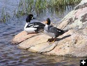 A pair of Barrows Goldeneye rest on a rock in the ponds near Soda Lake in May.